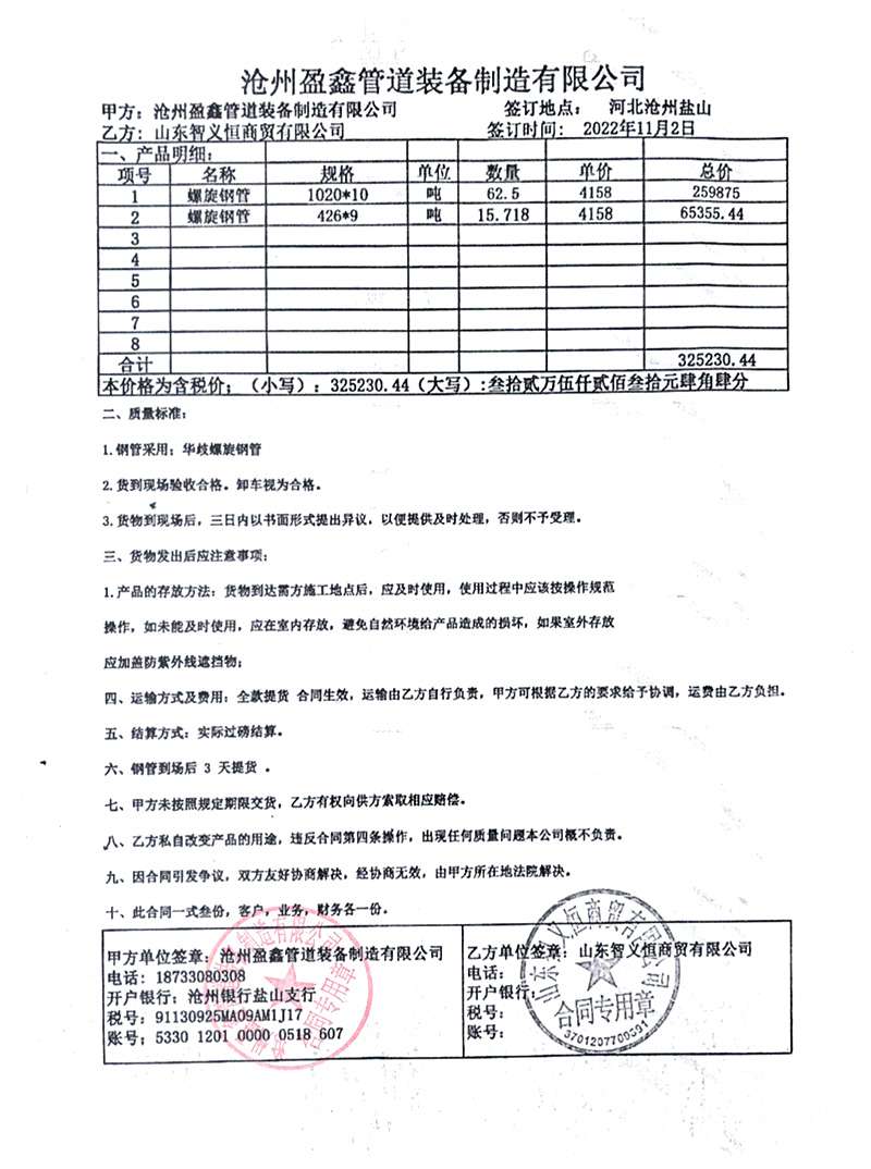 山東智義恒商(shāng)貿與(yǔ)我公司達成螺旋(xuán)鋼管管道采購(gòu)合作項目(mù)